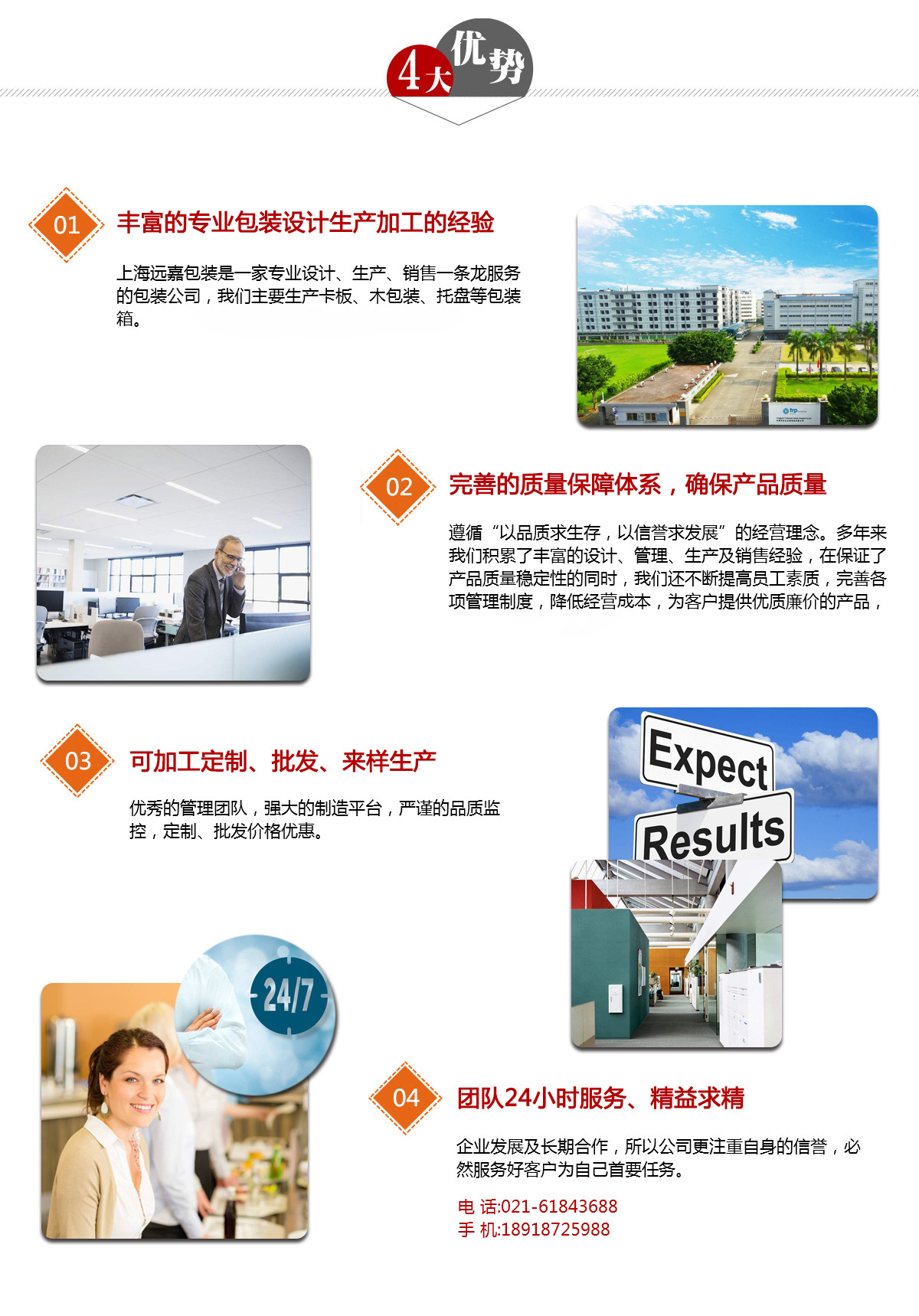 上海遠(yuǎn)嘉包裝技術(shù)有限公司擁有數(shù)年包裝設(shè)計(jì)生產(chǎn)經(jīng)驗(yàn)。為客戶設(shè)計(jì)定制各類出口包裝箱,木箱包裝,免熏蒸包裝箱,鋼帶箱,扣件包裝箱,花格箱,大型設(shè)備包裝箱,實(shí)木熏蒸包裝箱,木托盤,熏蒸及免熏蒸托盤,熱縮膜包裝等。